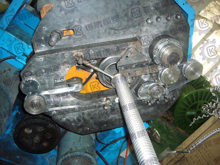 4.2.4?鎧裝主機(jī)成型系統(tǒng)在主軸出線端,由一臺(tái)15KW變頻電機(jī)帶動(dòng)一臺(tái)法國(guó)進(jìn)口設(shè)備行星齒輪差速變速器,通過(guò)同步帶帶動(dòng)裝在主軸上的行星齒輪及同步帶系統(tǒng),從而帶動(dòng)成形壓輪旋轉(zhuǎn)。放帶盤將帶材放出后經(jīng)過(guò)導(dǎo)輪由主軸中心孔進(jìn)入主軸出線端的鎧裝成型系統(tǒng),通過(guò)成形壓輪壓成形,經(jīng)過(guò)導(dǎo)帶裝置進(jìn)入一個(gè)螺旋狀的導(dǎo)向彎鉤,主機(jī)每轉(zhuǎn)一圈。成形的帶材繞在電纜上實(shí)現(xiàn)一個(gè)節(jié)距,通過(guò)主機(jī)的旋轉(zhuǎn)實(shí)現(xiàn)電纜的鎧裝。鋁帶成管鎧裝時(shí)的旋轉(zhuǎn)升角: