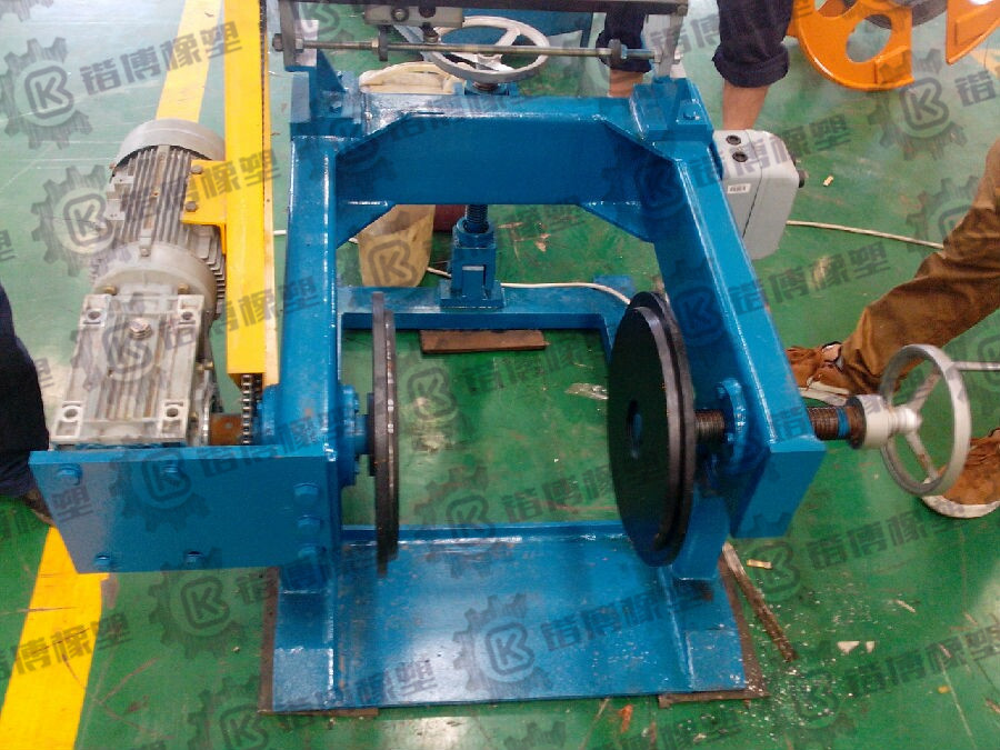 4.3.1?整機(jī)主框架為鋼板和型材焊接而成,通過(guò)一個(gè)伺服電機(jī)直聯(lián)蝸桿減速機(jī)帶動(dòng)一對(duì)嚙合齒輪,以保證上下牽引輪同步轉(zhuǎn)動(dòng),每個(gè)牽引輪各帶動(dòng)一條平皮帶傳動(dòng)。上下有五對(duì)氣缸驅(qū)動(dòng)壓緊裝置滾輪,使平皮帶壓緊電纜。平皮帶間距隨電纜直徑的不同而隨時(shí)變動(dòng),對(duì)于任何外徑的電纜,其中心高度不變。由氣動(dòng)系統(tǒng)均勻的調(diào)整夾緊壓力和控制上下氣缸的氣源。有一單獨(dú)氣缸用來(lái)調(diào)節(jié)上下平皮帶張緊力。牽引裝置兩端均有井式導(dǎo)線裝置,以保證電纜中心位置不變。帶電子計(jì)米。